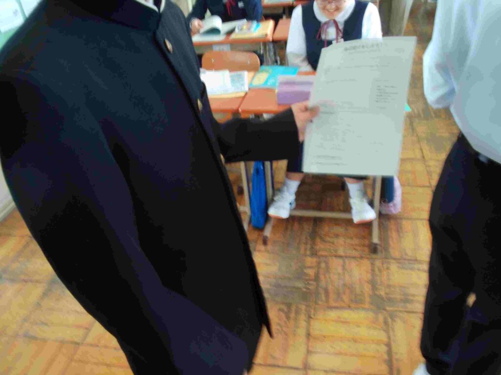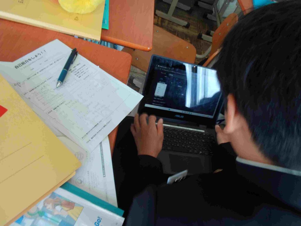 プリント完成(2年) 2026年4月22日 最終更新日時 : 2026年4月22日 kumagaya_edit 英語で自己紹介のプリントが完成した生徒が先生に確認してもらっています。タブレットで一生懸命英単語を調べています。