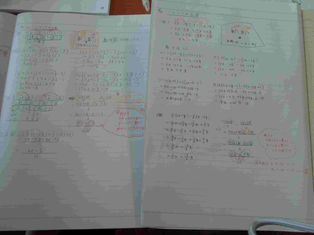 文字式の計算(2年) 2026年4月28日 最終更新日時 : 2026年4月28日 kumagaya_edit 分配法則を使った計算問題を解いています。分数が入ってくると途端に難しくなります。通分の仕方、項の前の-などに注意が必要です。