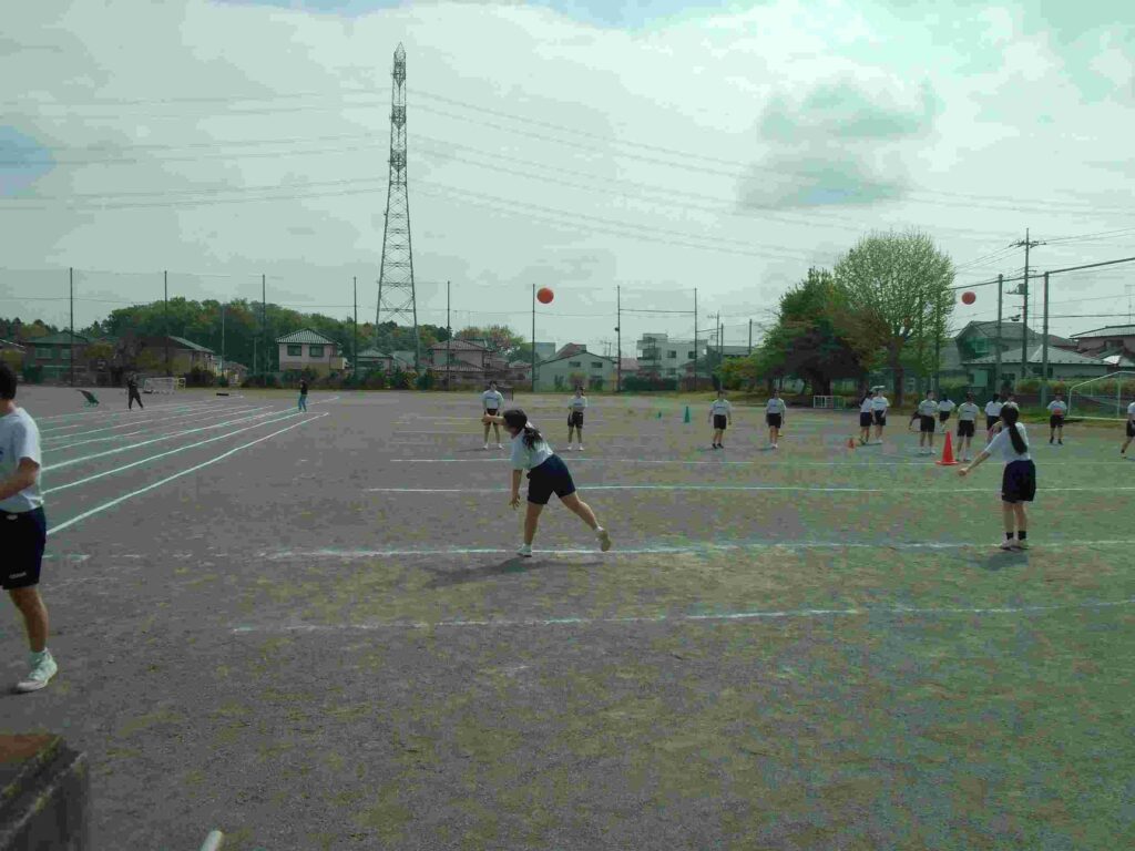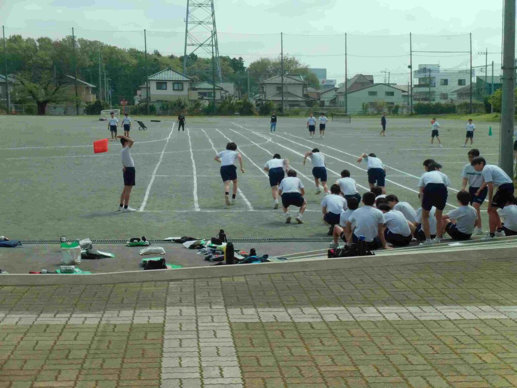 男子は50m走、女子はボール投げの練習をしています。