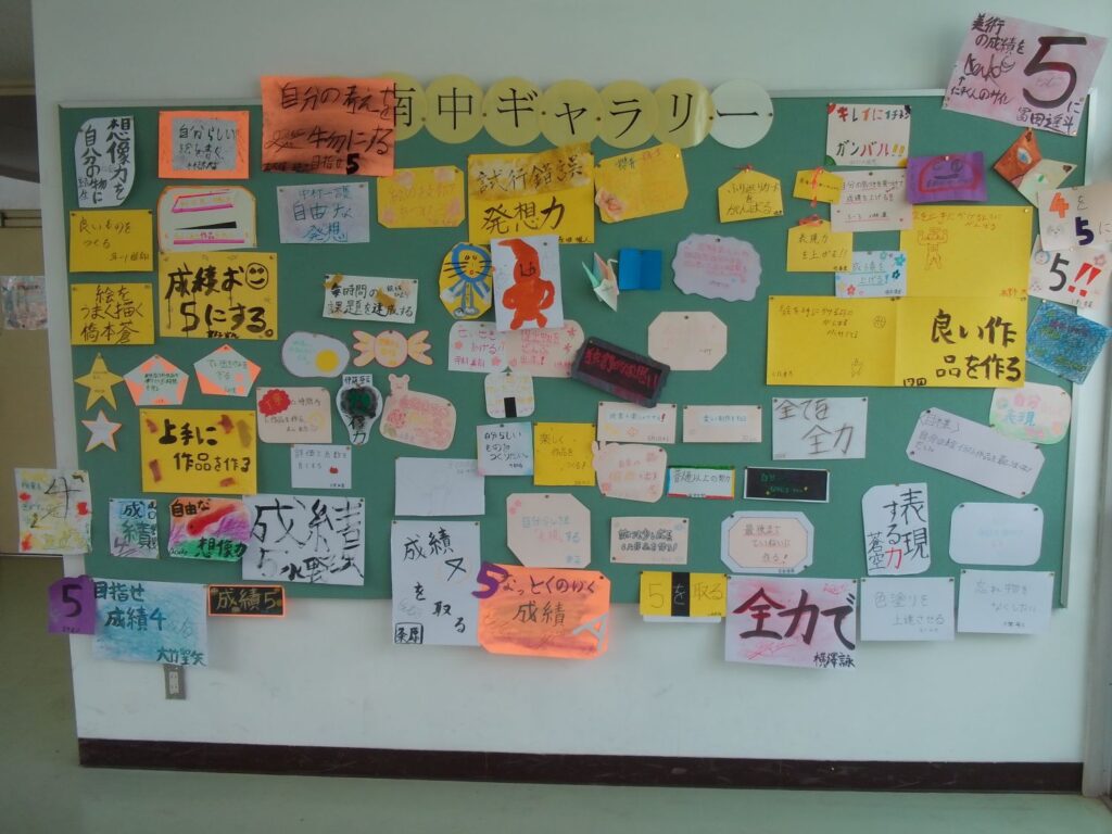 江南中ギャラリー 2026年4月21日 最終更新日時 : 2026年4月21日 kumagaya_edit 美術室前のギャラリーには、今年の美術への意気込みが掲示されています。メッセージだけでなく、紙の形や文字に工夫が見られます。