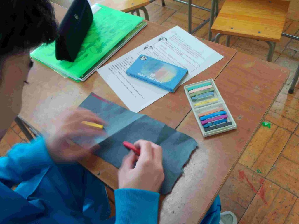 パステル、墨、絵具を使って、紙や和紙に字を書いています。素材研究というとのこと。