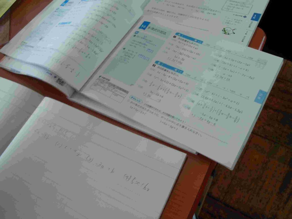 計算練習(2年) 2026年4月20日 最終更新日時 : 2026年4月20日 kumagaya_edit 授業の最後に、ワークで復習の時間をとっています。今日は文字式の計算、繰り返しながら覚えていきます。